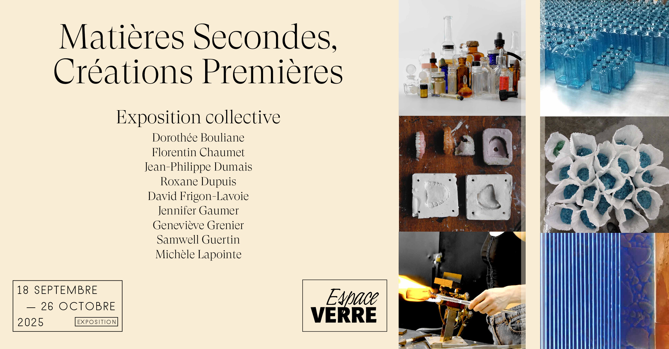 From September 18 to October 26, 2025, the Espace VERRE gallery will present Matières secondes, créations premières, a collective exhibition featuring the works of nine glass artists from Quebec: Dorothée Bouliane, Florentin Chaumet, Jean-Philippe Dumais, Roxane Dupuis, David Frigon-Lavoie, Jennifer Gaumer, Geneviève Grenier, Samwell Guertin, and Michèle Lapointe. Together, they were summoned to explore a poetic and socially engaged theme: recycled, reclaimed, and repurposed glass.